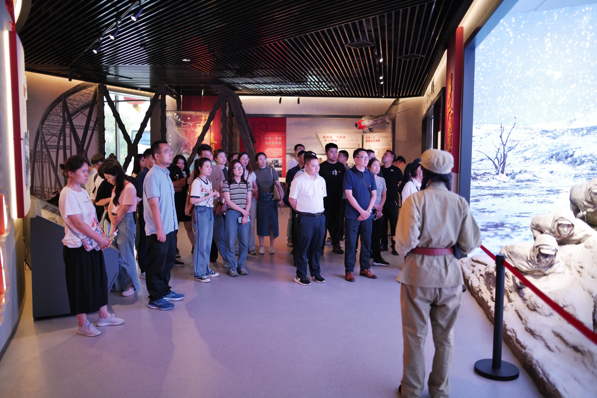 在活動現(xiàn)場,“抗美援朝保家園、鮮紅戰(zhàn)旗美如畫、勇士輝煌化金星、繼往開來譜新篇”四個(gè)展覽單元全面展示了一幅中國人民志愿軍奪取抗美援朝戰(zhàn)爭偉大勝利的歷史長卷。黨員們沿著紅色文化長廊前行,認(rèn)真傾聽那些驚心動魄的戰(zhàn)斗故事,觀看全息投影和實(shí)景搭建的戰(zhàn)斗現(xiàn)場,沿著英雄們的足跡,追尋那段不朽的歷史記憶,身臨其境地感受了戰(zhàn)爭的激烈與殘酷,深入感悟英雄的豪邁愛國情懷以及“忠孝勤儉、敬業(yè)守法、誠實(shí)友愛、葆真求善”的家風(fēng)內(nèi)涵。