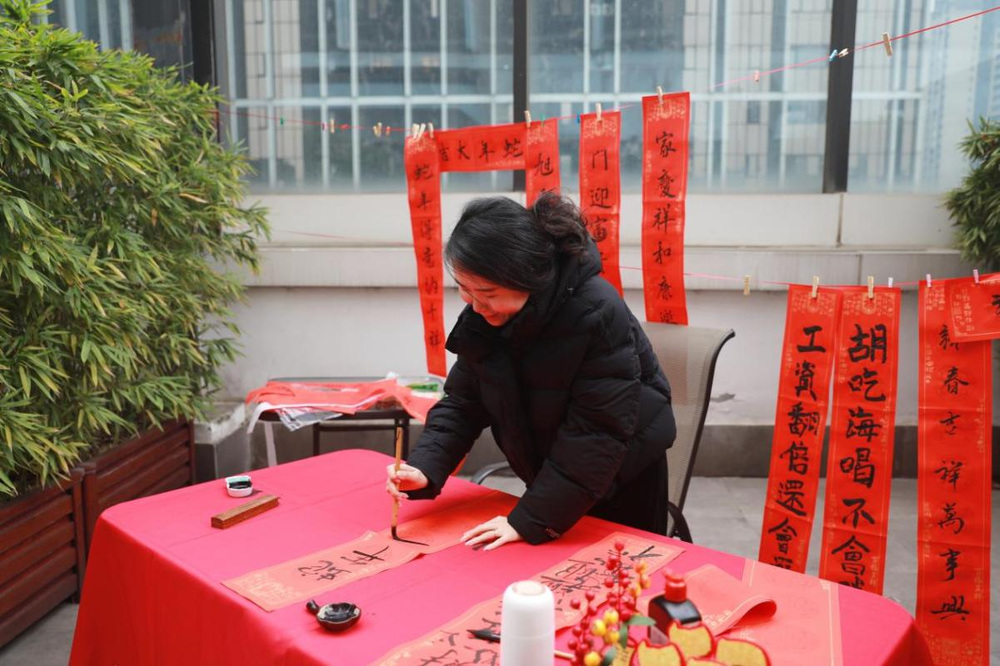 “迎春寫對(duì)聯(lián)”隨著職工書寫的鋪氈、蘸墨、揮毫,筆鋒一起一落,一幅幅對(duì)仗工整、寓意吉祥的春聯(lián)躍然紙上。
